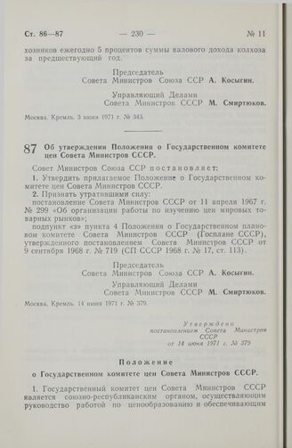 Постановление Совета Министров СССР. Об утверждении Положения о Государственном комитете цен Совета Министров СССР. 14 июня 1971 г. № 379