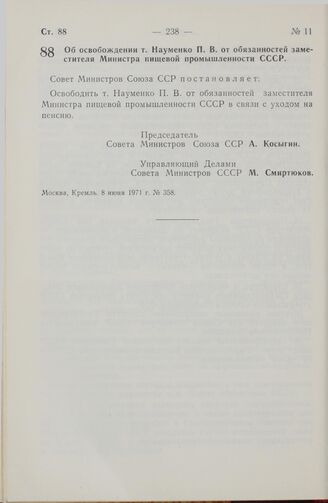 Постановление Совета Министров СССР. Об освобождении т. Науменко П. В. от обязанностей заместителя Министра пищевой промышленности СССР. 8 июня 1971 г. № 358