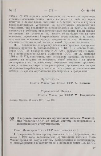 Постановление Совета Министров СССР. О переводе геологических организаций системы Министерства геологии СССР на новую систему планирования и экономического стимулирования. 25 июня 1971 г. № 435