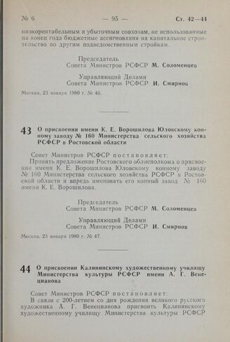 Постановление Совета Министров РСФСР. О присвоении Калининскому художественному училищу Министерства культуры РСФСР имени А.Г. Венецианова. 11 февраля 1980 г. № 72