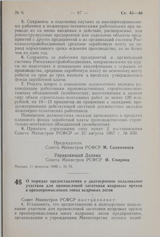 Постановление Совета Министров РСФСР. О порядке предоставления в долгосрочное пользование участков для промысловой заготовки кедровых орехов в орехопромысловых зонах кедровых лесов. 11 февраля 1980 г. № 74