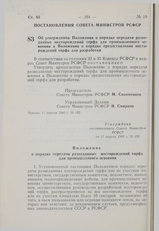 Постановление Совета Министров РСФСР. Об утверждении Положения о порядке передачи разведанных месторождений торфа для промышленного освоения и Положения о порядке предоставления месторождений торфа для разработки. 17 апреля 1980 г. № 192