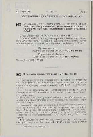 Постановление Совета Министров РСФСР. О создании туристского центра в г. Новгороде. 7 мая 1980 г. № 236