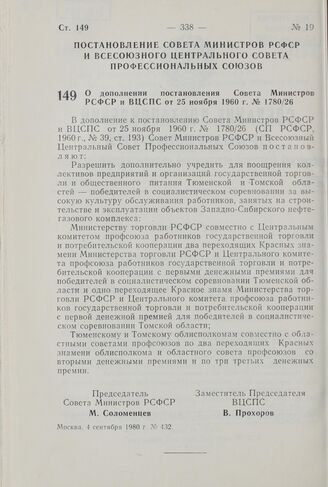 Постановление Совета Министров РСФСР и Всесоюзного Центрального Совета Профессиональных Союзов. О дополнении постановления Совета Министров РСФСР и ВЦСПС от 25 ноября 1960 г. № 1780/26. 4 сентября 1980 г. № 432