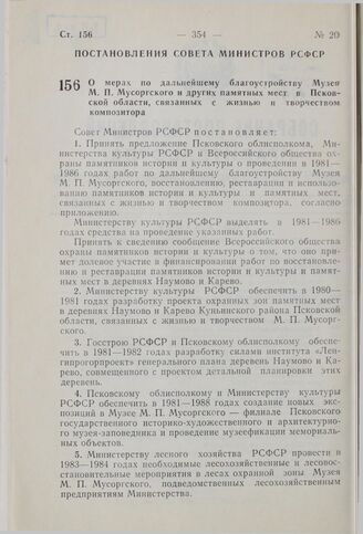 Постановление Совета Министров РСФСР. О мерах по дальнейшему благоустройству Музея М.П. Мусоргского и других памятных мест в Псковской области, связанных с жизнью и творчеством композитора. 22 августа 1980 г. № 415