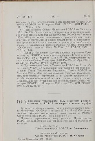 Постановление Совета Министров РСФСР. О признании утратившими силу некоторых решений Правительства РСФСР по вопросам кинематографии. 26 сентября 1980 г. № 463