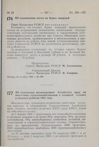 Постановление Совета Министров РСФСР. Об инициативе механизаторов Алтайского края по подготовке сельскохозяйственной и поливной техники к полевым работам 1981 года. 10 октября 1980 г. № 481