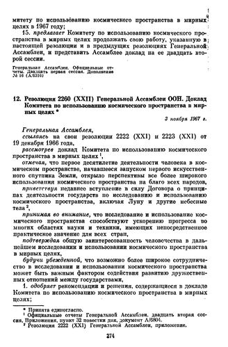Резолюция 2260 (XXII) Генеральной Ассамблеи ООН. Доклад Комитета по использованию космического пространства в мирных, целях. 3 ноября 1967 г.
