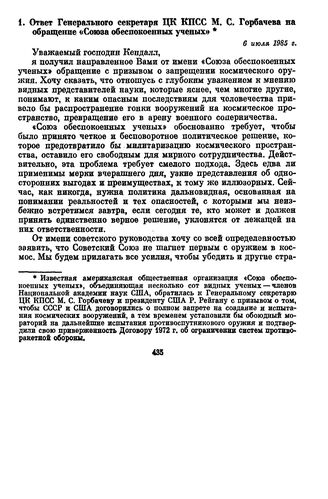 Ответ Генерального секретаря ЦК КПСС М.С. Горбачева на обращение «Союза обеспокоенных ученых». 6 июля 1985 г. // Правда, 1985, 6 июля.