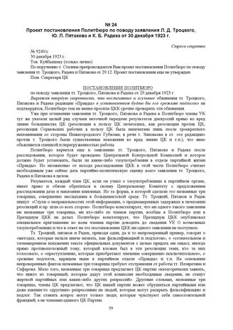 Проект постановления Политбюро по поводу заявления Л.Д. Троцкого, Ю.Л. Пятакова и К.Б. Радека от 30 декабря 1923 г. № 9240/с // РГАСПИ. Ф. 17. Оп. 171. Д. 29. Л. 80–82. Копия. Машинопись.