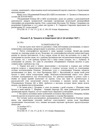 Письмо Л.Д. Троцкого в Секретариат ЦК от 24 октября 1927 г. № 138/с // РГАСПИ. Ф. 17. Оп. 171. Д. 82. Л. 113. Копия. Машинопись.