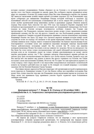Докладная записка Г.Г. Ягоды И.В. Сталину от 29 октября 1928 г. о самоубийстве А.А. Генрихсона с материалами расследования данного факта. № 220253 // РГАСПИ. Ф. 17. Оп. 171. Д. 136. Л. 20, 32–41. Копия. Машинопись.