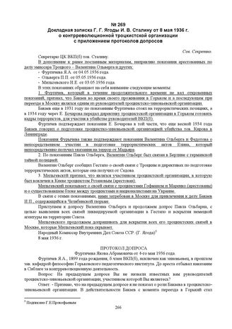 Докладная записка Г.Г. Ягоды И.В. Сталину от 8 мая 1936 г. о контрреволюционной троцкистской организации с приложением протоколов допросов // РГАСПИ. Ф. 17. Оп. 171. Д. 223. Л. 120–159. Копия. Машинопись.