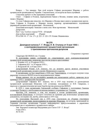 Докладная записка Г.Г. Ягоды И.В. Сталину от 9 мая 1936 г. о контрреволюционной троцкистской организации с приложением протоколов допросов. № 56 232