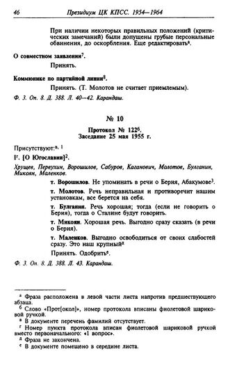 Президиум ЦК КПСС. 1954-1964. Черновые протокольные записи заседаний. Стенограммы. Постановления. В 3 т. Т. 1. Черновые протокольные записи заседаний. Стенограммы. — М.: РОССПЭН, 2003.