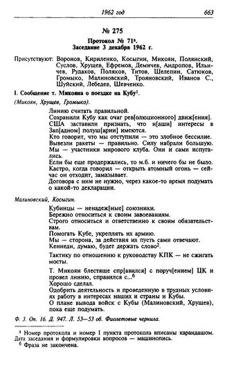 Протокол № 71. Заседание 3 декабря 1962 г. // Ф. 3. Оп. 16. Д. 947. Л. 53—53 об. Фиолетовые чернила.