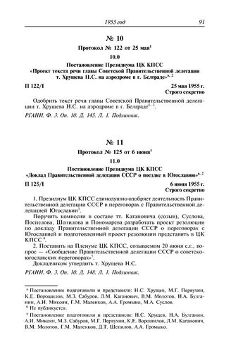 Протокол № 122 от 25 мая. Постановление Президиума ЦК КПСС «Проект текста речи главы Советской Правительственной делегации т. Хрущева Н.С. на аэродроме в г. Белграде». 25 мая 1955 г.