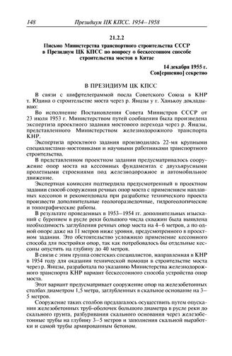 Протокол № 174 от 15 декабря. Письмо Министерства транспортного строительства СССР в Президиум ЦК КПСС по вопросу о бескессонном способе строительства мостов в Китае. 14 декабря 1955 г. // АП РФ. Ф. 3. Оп. 65. Д. 503. Л. 149—151. Подлинник.