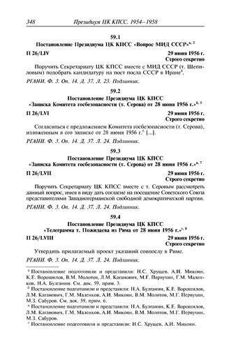 Президиум ЦК КПСС. 1954-1964. Черновые протокольные записи заседаний. Стенограммы. Постановления. В 3 т. Т. 2. Постановления. 1954-1958. — М.: РОССПЭН, 2006.