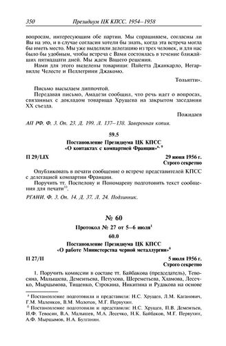 Президиум ЦК КПСС. 1954-1964. Черновые протокольные записи заседаний. Стенограммы. Постановления. В 3 т. Т. 2. Постановления. 1954-1958. — М.: РОССПЭН, 2006.