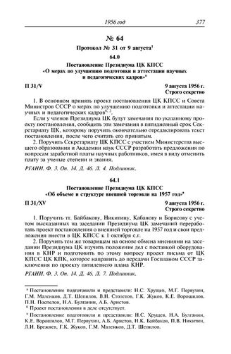 Протокол № 31 от 9 августа. Постановление Президиума ЦК КПСС «О мерах по улучшению подготовки и аттестации научных и педагогических кадров». 9 августа 1956 г.