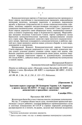 Протокол № 62 от 6 декабря. Приложение 3. Замечания первого секретаря ЦК Компартии Украины А.И. Кириченко к проекту письма ЦК КПСС «О мерах по пресечению “действий” антисоветских и враждебных элементов». 6 декабря 1956 г.