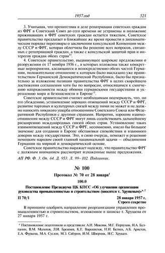 Протокол № 70 от 28 января. Постановление Президиума ЦК КПСС «Об улучшении организации руководства промышленностью и строительством (вносится т. Хрущевым)». 28 января 1957 г.