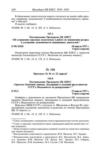 Протокол № 90 от 18 апреля. Постановление Президиума ЦК КПСС «Об устранении серьезных недостатков в работе по повышению ресурса и улучшению экономичности авиационных двигателей». 18 апреля 1957 г.