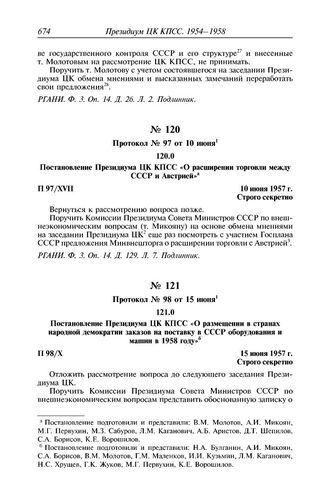 Протокол № 97 от 10 июня. Постановление Президиума ЦК КПСС «О расширении торговли между СССР и Австрией». 10 июня 1957 г.