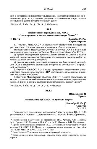 Протокол № 116 от 10—11 октября. Постановление Президиума ЦК КПСС «О мероприятиях в связи с положением вокруг Сирии». 11 октября 1957 г. // РГАНИ. Ф. 3. Оп. 14. Д. 154. Л. 5—6. Подлинник.