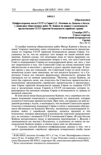 Протокол № 126 от 15 ноября. Приложение. Шифртелеграмма посла СССР в Сирии С.С. Немчины из Дамаска о беседе с министром общественных работ Ф. Кайяли по вопросу о возможности предоставления СССР гарантий безопасности сирийских границ. 13 ноября 1957 г. // АП РФ. Ф. 3. Оп. 66. Д. 273. Л. 35—37. Заверенная копия. Экземпляр Н.С. Хрущева.
