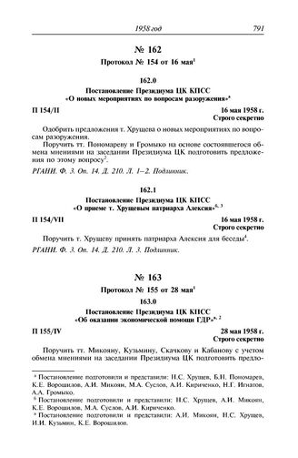 Протокол № 154 от 16 мая. Постановление Президиума ЦК КПСС «О приеме т. Хрущевым патриарха Алексия». 16 мая 1958 г.