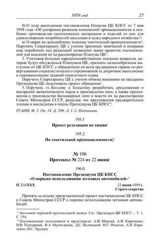 Протокол № 224 от 22 июня. Постановление Президиума ЦК КПСС «О порядке использования легковых автомобилей». 22 июня 1959 г.