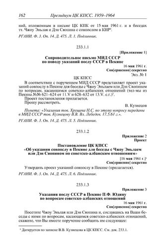 Протокол № 328 от 17 мая. Приложение 1. Сопроводительное письмо МИД СССР по поводу указаний послу СССР в Пекине. 16 мая 1961 г.