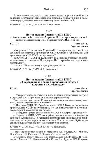 Протокол № 328 от 17 мая. Постановление Президиума ЦК КПСС «О материалах к беседам тов. Хрущева Н.С. во время предстоящей неофициальной встречи с президентом США Кеннеди». 17 мая 1961 г.