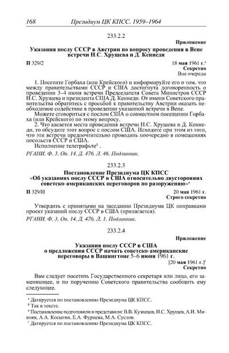 Протокол № 328 от 17 мая. Постановление Президиума ЦК КПСС «Об указаниях послу СССР в США относительно двусторонних советско-американских переговоров по разоружению». 20 мая 1961 г.