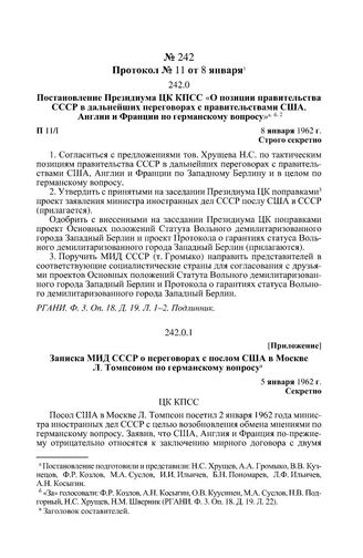 Протокол № 11 от 8 января. Постановление Президиума ЦК КПСС «О позиции правительства СССР в дальнейших переговорах с правительствами США, Англии и Франции по германскому вопросу». 8 января 1962 г. // РГАНИ. Ф. 3. Оп. 18. Д. 19. Л. 1-2. Подлинник.