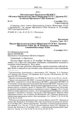 Протокол № 61 от 25 октября. Постановление Президиума ЦК КПСС «Об ответе Председателя Совета Министров СССР т. Хрущева Н.С. на письмо Президента США Кеннеди». 25 октября 1962 г.