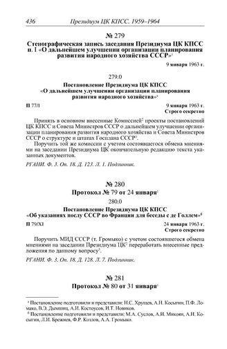 Протокол № 79 от 24 января. Постановление Президиума ЦК КПСС «Об указаниях послу СССР во Франции для беседы с де Голлем». 24 января 1963 г.