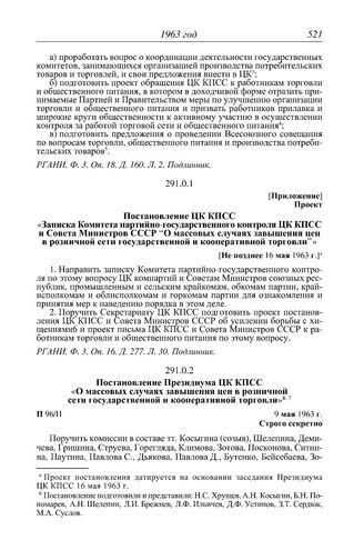 Протокол № 97 от 16 мая. Постановление Президиума ЦК КПСС «О массовых случаях завышения цен в розничной сети государственной и кооперативной торговли». 9 мая 1963 г.