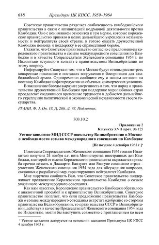 Протокол № 125 от 4 декабря. Приложение 2 к пункту XVII прот. № 125. Устное заявление МИД СССР посольству Великобритании в Москве о необходимости созыва международного совещания по Камбодже. [Не позднее 4 декабря 1963 г.] // РГАНИ. Ф. 3. Оп. 18. Д. 206. Л. 79. Подлинник.