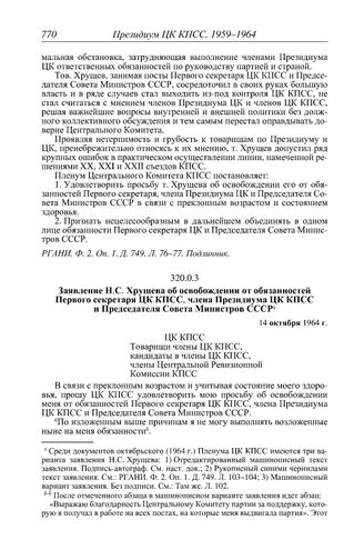 Протокол № 164 от 13-14 октября. Заявление Н.С. Хрущева об освобождении от обязанностей Первого секретаря ЦК КПСС, члена Президиума ЦК КПСС и Председателя Совета Министров СССР. 14 октября 1964 г.