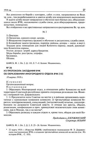 Из протокола заседания ВЧК об образовании иногороднего отдела ВЧК. 18 марта 1918 г. // ЦАФСБ. Ф. 1. Оп. 2. Д. 2. Л. 25—26. Копия. Машинопись.