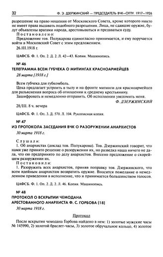 Главная Серия «Россия. XX век. Документы» Ф.Э.Дзержинский — председатель ВЧК—ОГПУ. 1917—1926 Из протокола заседания ВЧК о разоружении анархистов. 30 марта 1918 г.