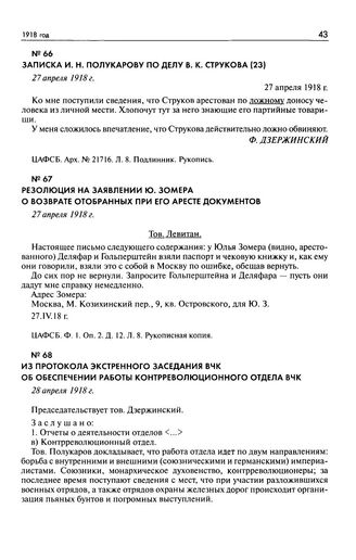 Из протокола экстренного заседания ВЧК об обеспечении работы контрреволюционного отдела ВЧК. 28 апреля 1918 г. // ЦАФСБ. Ф. 1. Оп. 2. Д. 2. Л. 98—99. Копия. Машинопись.