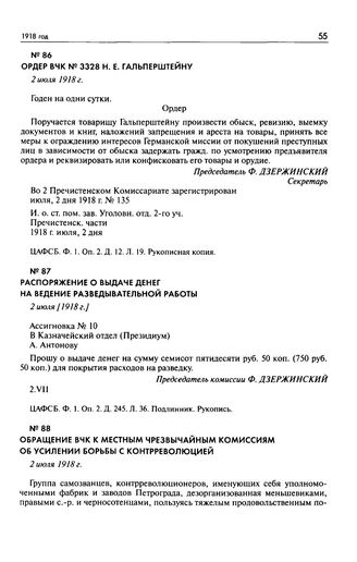 Ордер ВЧК № 3328 Н.Е. Гальперштейну. 2 июля 1918 г. // ЦАФСБ. Ф. 1. Оп. 2. Д. 12. Л. 19. Рукописная копия.