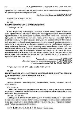 Из протокола № 53 заседания коллегии НКВД о согласовании действий транспортной милиции и ТЧК. 6 сентября 1918 г. // ГАРФ. Ф. 1235. Оп. 93. Д. 91. Л. 9—10. Копия. Машинопись.