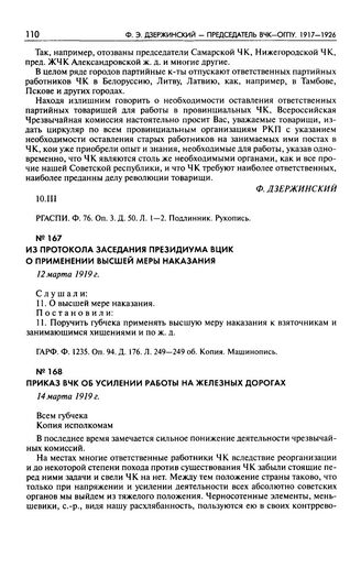 Приказ ВЧК об усилении работы на железных дорогах. 14 марта 1919 г. // ЦАФСБ. Ф. 66. Оп. 1. Д. 86. Л. 20. Типографский экз.