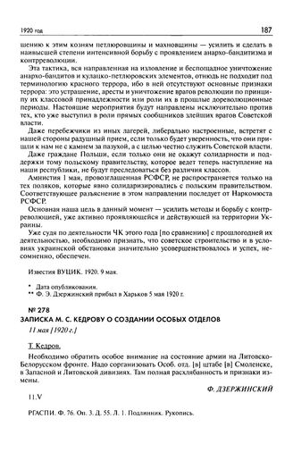 Записка М.С. Кедрову о создании особых отделов. 11 мая [1920 г.]