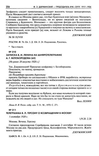 Телеграмма В.Л. Герсону о возвращении в Москву. 1 сентября 1920 г. // ЦАФСБ. Ф. 1. Оп. 4. Д. 119. Л. 30. Подлинник. Машинопись.